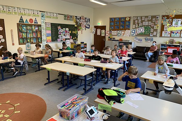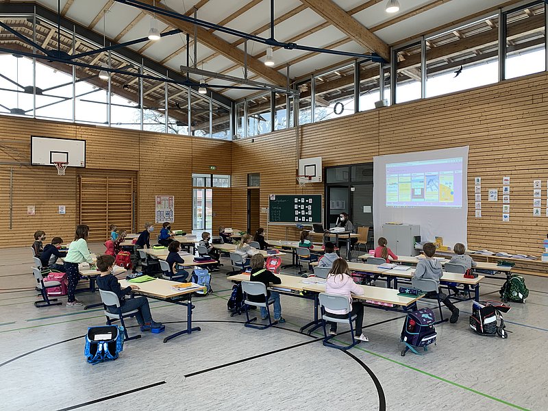 Statt Wechselunterricht ist es möglich, die Kinder mit Abstand, dafür aber alle gleichzeitig zu unterrichten. Dies geht nur, weil uns in diesem Schuljahr mehrere freie Klassenzimmer zur Verfügung stehen. Auch die Turnhalle wurde zum Klassenzimmer umfunktioniert. Außerdem haben wir das große Glück, ebenso unsere Bundesfreiwillige miteinspannen zu können.