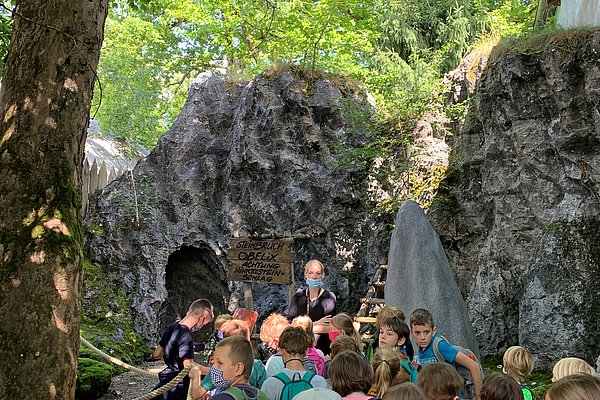 Judith Heckel hat sich dankenswerterweise wieder die Zeit genommen, mit der 4. Klasse den letzten Teil des Mühlenweges zu erkunden. Bei idealen Wander-wetter besuchten die Schülerinnen und Schüler unter anderem eine Stelle, an der früher Gips abgebaut wurde und bewunderten anschließend die Stuckarbeiten in der Kirche St. Leonhard in Nußdorf.