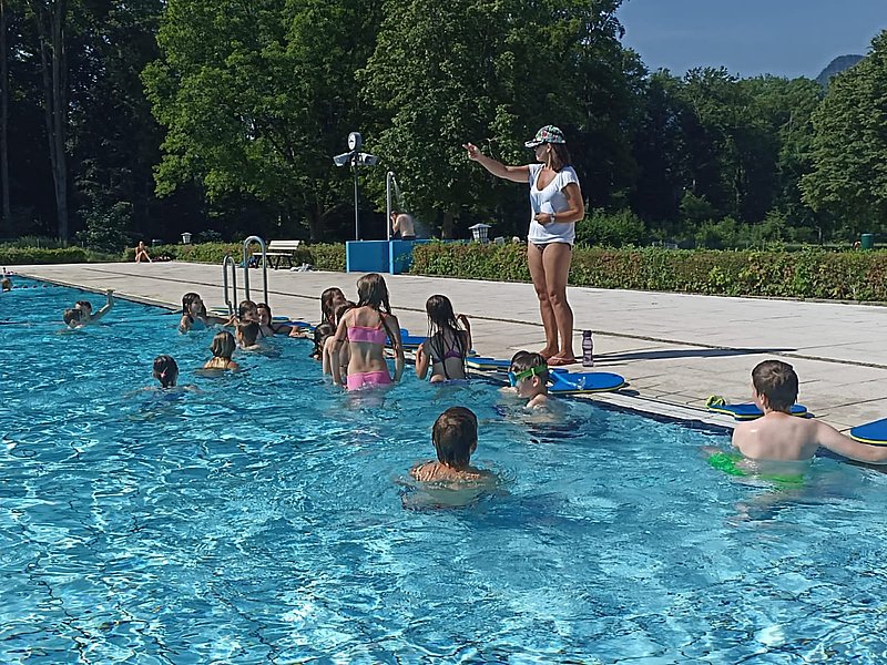 (4. Klasse, 18.06.21 und 23.07.2021)An zwei sehr heißen Tagen verlegte die 4. Klasse ihren Sportunterricht ins Freibad. Zu Fuß marschierten wir vorbei am Sportplatz und den Erdbeerfeldern ins Schwimmbad. Neben spielerischen Übungen zum Brustschwimmen, trainierten wir auch die Ausdauer beim Schwimmen. Auch eine Bahn auf Zeit schwimmen, machten die Schülerinnen und Schüler mit Begeisterung. Wer Lust hatte, durfte zudem noch vom 1m – Brett bzw. vom 3m – Brett springen. Die „Badeausflüge“ ins „Nussi“ fanden alle Kinder einfach toll!!