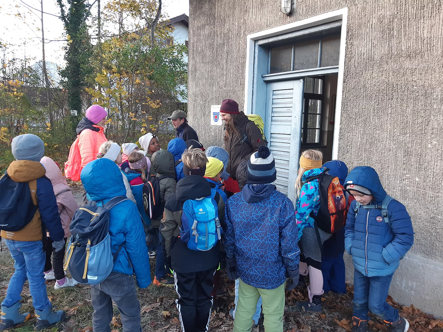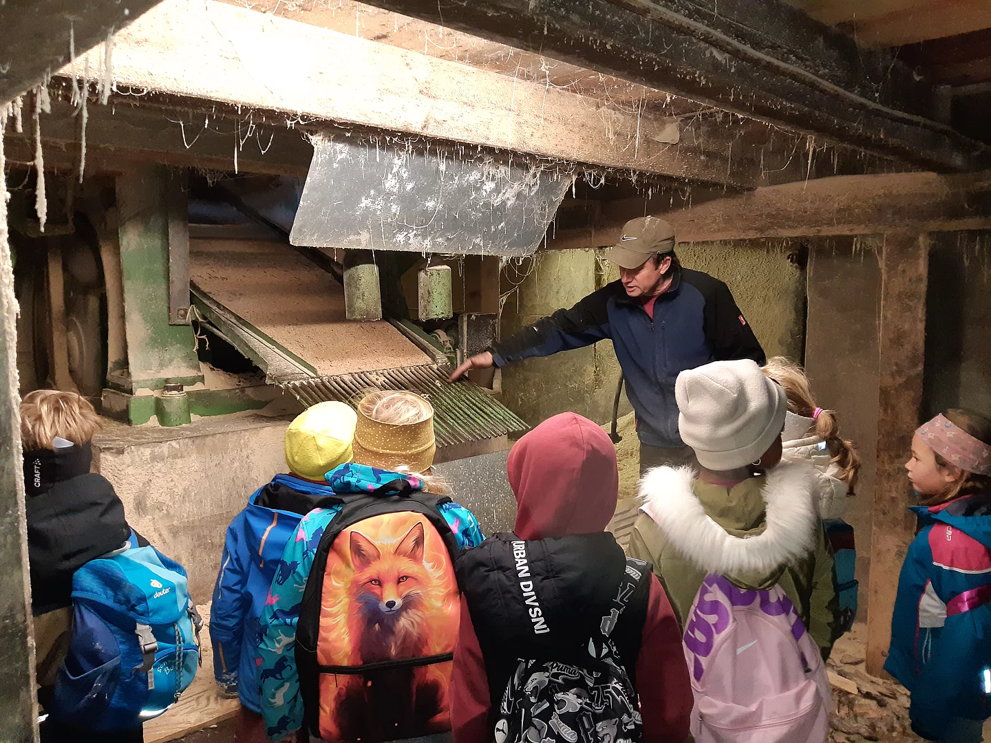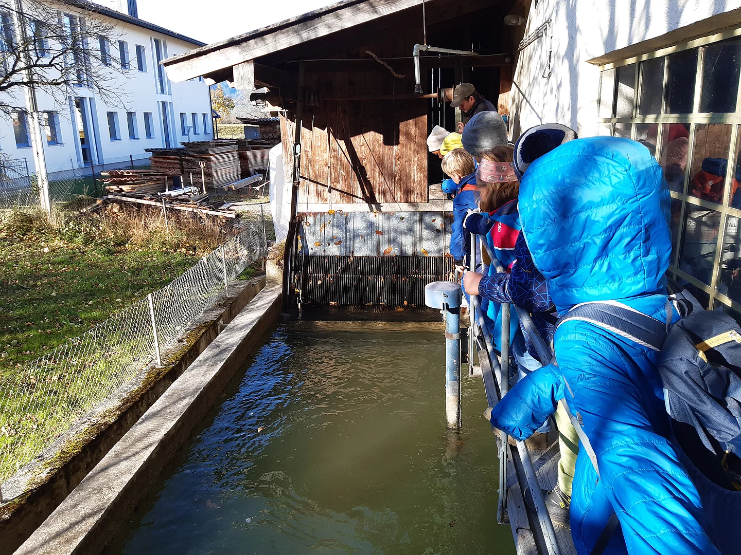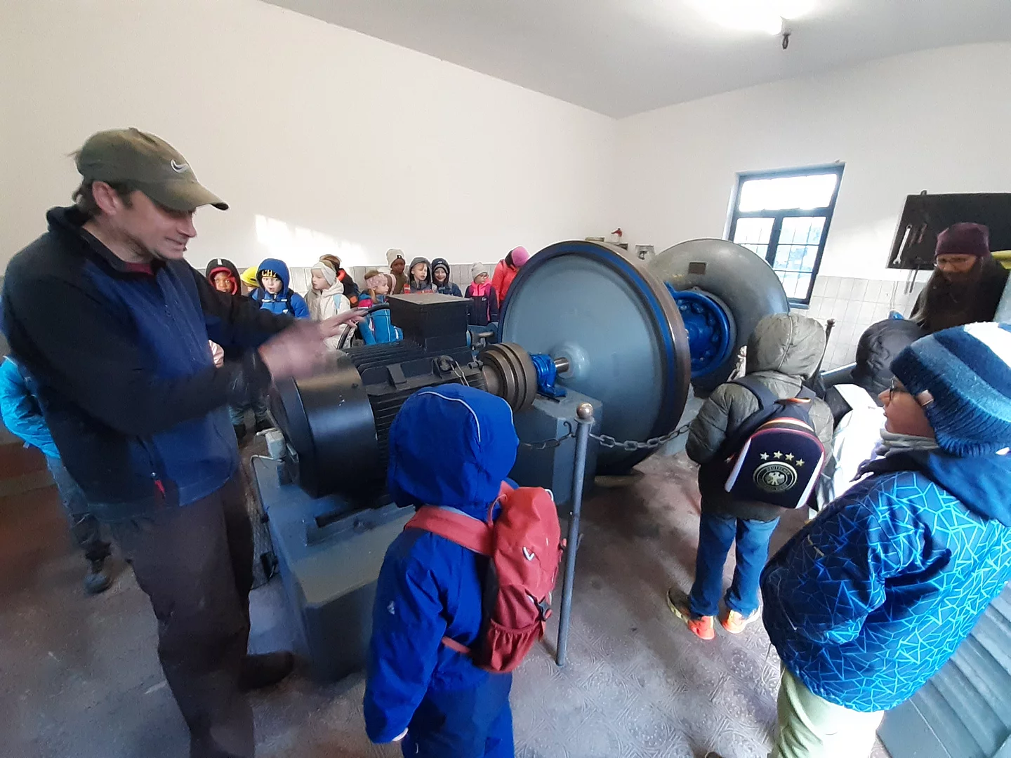 Zuerst sperrte uns Wolfgang sein kleines Elektrizitätswerk auf, das damals für die ertsen Haushalte in Nussdorf den Strom produzierte. Anschlieißend zersägte er uns im benachbarten Sägewerk einen Stamm zu Brettern und zeigte uns, wohin das Sägemehl fiel und wie es mit dem Elevator in den 1. Stock transportiert wurde. Auch wie die Sägeblätter geschärft wurden konnten wir beobachten. Unser Weg führte uns über den "Lederer" zum "Neuschmid", zum "Steinschmid" bis hin zu dem Punkt, an dem der Mühlbach aus dem Steinbach geleitet wird. Die Bedienung der Schleuse dort unterliegt dem Wuhrmeister. Nun ging es auf dem direkten Weg zurück zur Schule, wo wir uns wieder stärken und aufwärmen konnten.