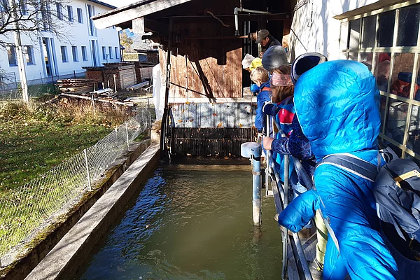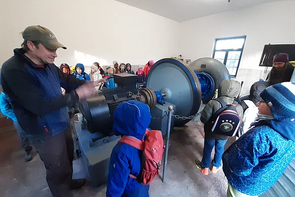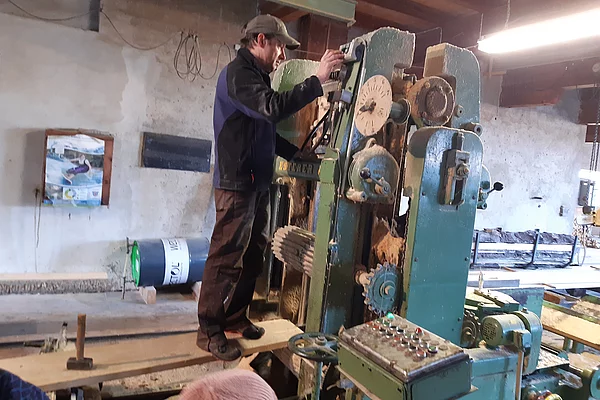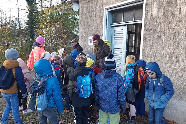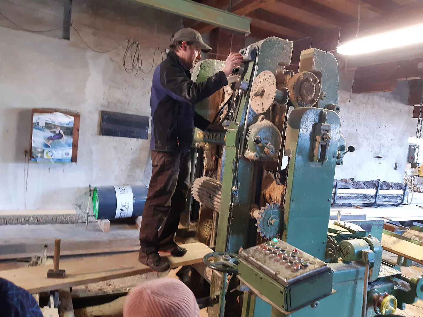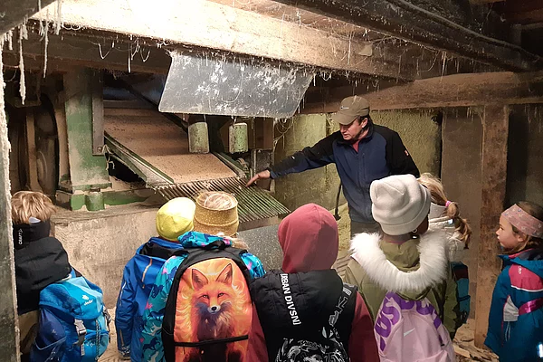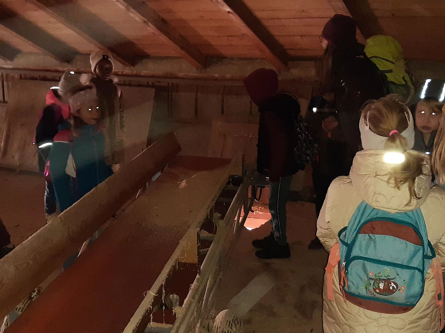 Zuerst sperrte uns Wolfgang sein kleines Elektrizitätswerk auf, das damals für die ertsen Haushalte in Nussdorf den Strom produzierte. Anschlieißend zersägte er uns im benachbarten Sägewerk einen Stamm zu Brettern und zeigte uns, wohin das Sägemehl fiel und wie es mit dem Elevator in den 1. Stock transportiert wurde. Auch wie die Sägeblätter geschärft wurden konnten wir beobachten. Unser Weg führte uns über den "Lederer" zum "Neuschmid", zum "Steinschmid" bis hin zu dem Punkt, an dem der Mühlbach aus dem Steinbach geleitet wird. Die Bedienung der Schleuse dort unterliegt dem Wuhrmeister. Nun ging es auf dem direkten Weg zurück zur Schule, wo wir uns wieder stärken und aufwärmen konnten.