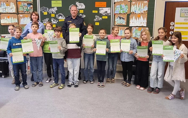Die 4. Klasse besuchte an vier Schultagen Ende September und im Oktober die Jugendverkehrsschule in Brannenburg. Unter der Anleitung des Polizisten Herrn Wicha erlernten die Schülerinnen und Schüler dort das regelkonforme Radfahren im Straßenverkehr. Auf dem Übungsplatz der Jugendverkehrsschule trainierten die Kinder unter anderem das Vorbeifahren an einem Hindernis sowie das korrekte Abbiegen nach rechts und links. Herr Wicha erklärte ihnen zudem die Vorfahrtsregeln sowie verschiedene Verkehrszeichen. Alle Schülerinnen und Schüler mussten am Ende der Verkehrserziehung eine theoretische sowie eine praktische Prüfung ablegen. Jedes Kind hat beide Prüfungen bestanden. Gratulation! An die Kinder wurde anschließend eine Urkunde überreicht.